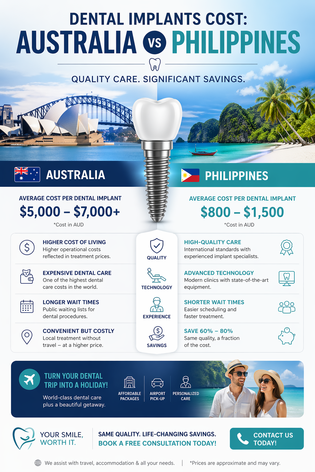 In Australia, All-on-4 treatment can be financially overwhelming for many patients. This has led to a growing interest in dental tourism, particularly in the Philippines, where costs are significantly lower.
