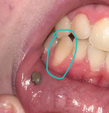 A metal stud visible on the lip is unrelated to the dental condition.