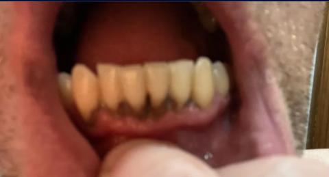 Red, inflamed gum tissue consistent with chronic irritation
