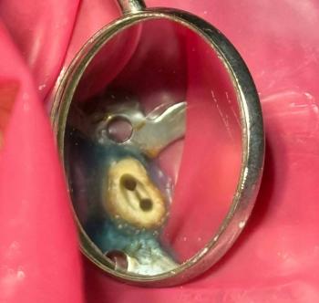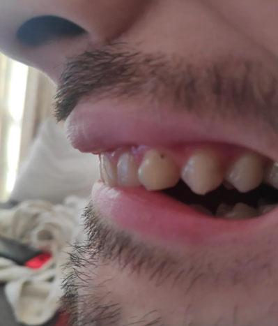 Tooth surfaces show yellowish discoloration, suggesting plaque retention rather than deep decay