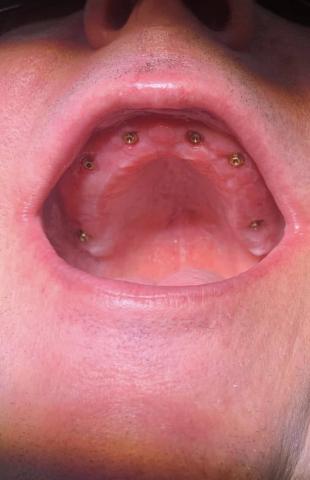 Tissue margins around some abutments look slightly inflamed — could be normal healing irritation, plaque accumulation, or early mucositis around the abutments.